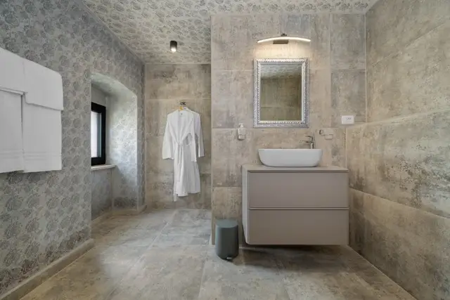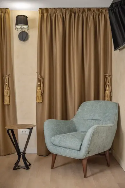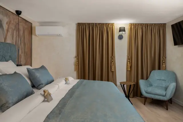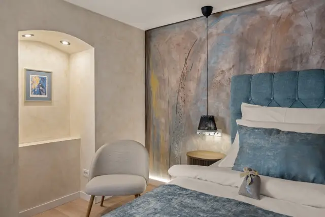 The decor and design have been thoughtfully curated by one of the three hosts, who is an established artist and decorator. This includes hand-painted interior and exterior walls and facades, created using a special sponge technique. The rooms are decorated in different colors, with walls and furnishings carefully matched to the color scheme of each room, creating a harmonious and aesthetically pleasing atmosphere. Throughout the hallways, guests can admire paintings from the owners’ private collection, adding a personal and artistic touch to the residence.