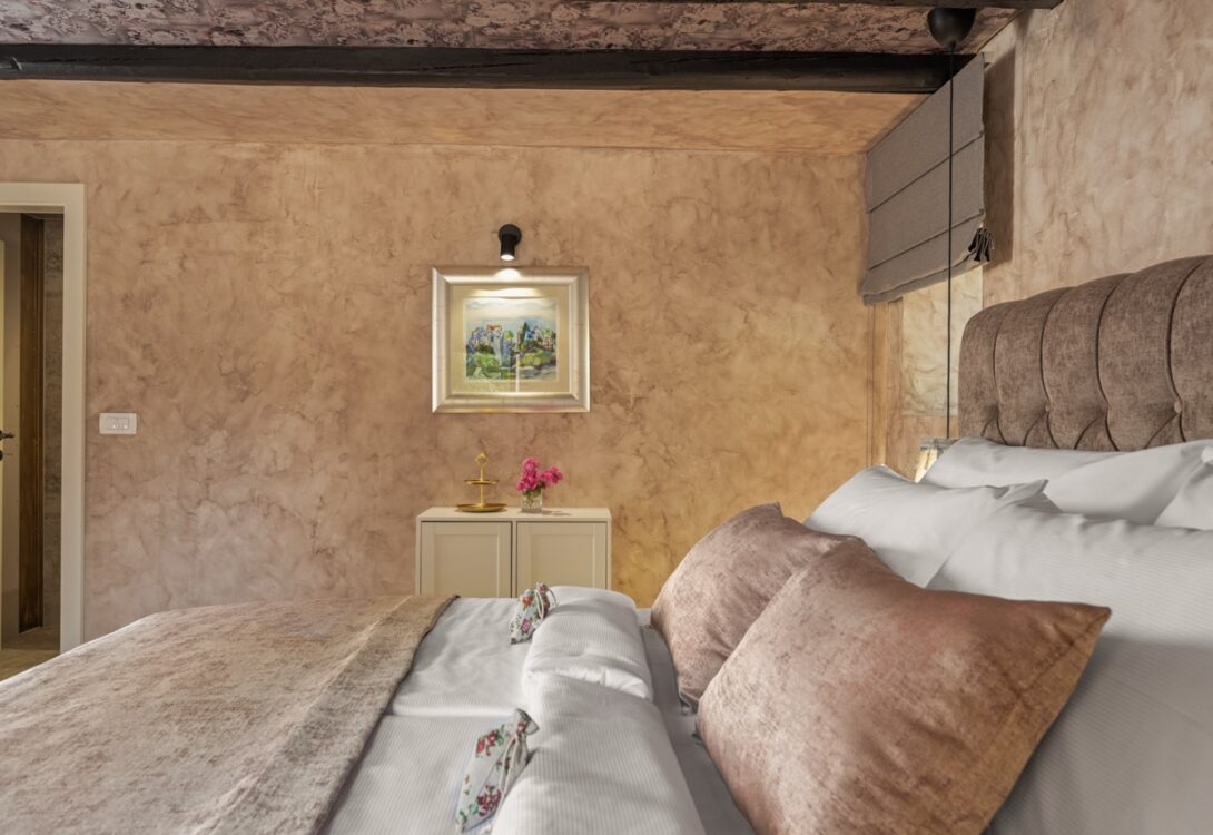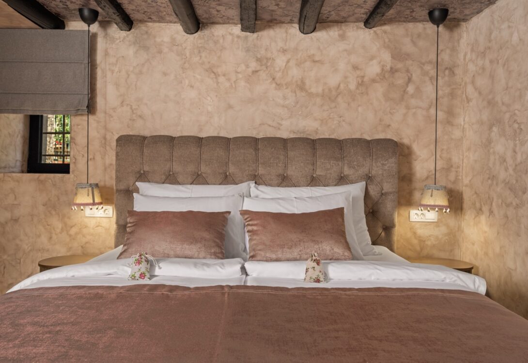 The decor and design have been thoughtfully curated by one of the three hosts, who is an established artist and decorator. This includes hand-painted interior and exterior walls and facades, created using a special sponge technique. The rooms are decorated in different colors, with walls and furnishings carefully matched to the color scheme of each room, creating a harmonious and aesthetically pleasing atmosphere. Throughout the hallways, guests can admire paintings from the owners’ private collection, adding a personal and artistic touch to the residence.