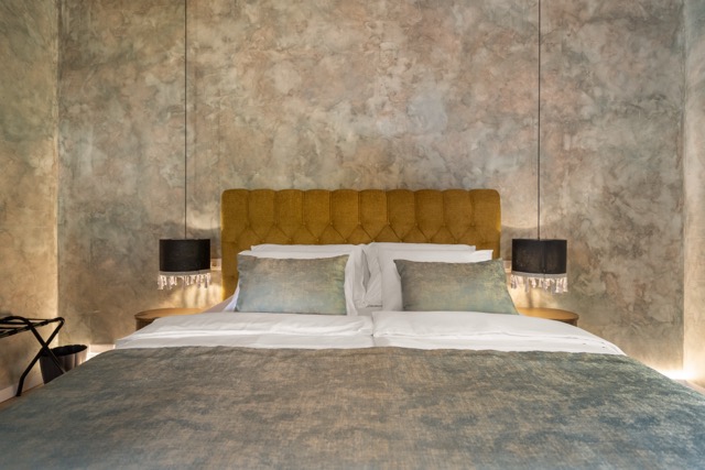 The decor and design have been thoughtfully curated by one of the three hosts, who is an established artist and decorator. This includes hand-painted interior and exterior walls and facades, created using a special sponge technique. The rooms are decorated in different colors, with walls and furnishings carefully matched to the color scheme of each room, creating a harmonious and aesthetically pleasing atmosphere. Throughout the hallways, guests can admire paintings from the owners’ private collection, adding a personal and artistic touch to the residence.